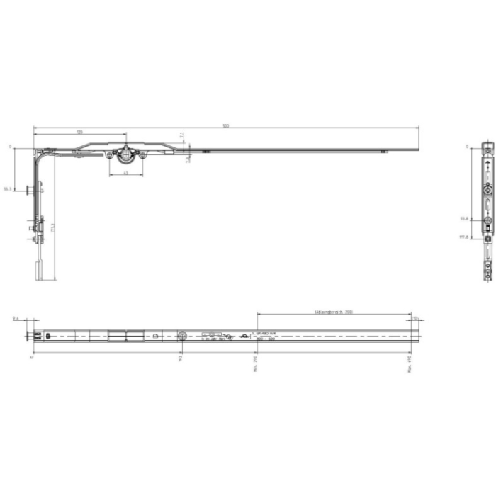 734530 ROTO crémone OB avec renvoi d'angle bas - axe 8mm / 300-600mm / poignée à 120