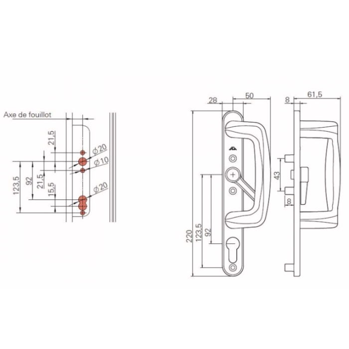 Poignée Inline intérieure plaque longue avec perçage cylindre avec levier